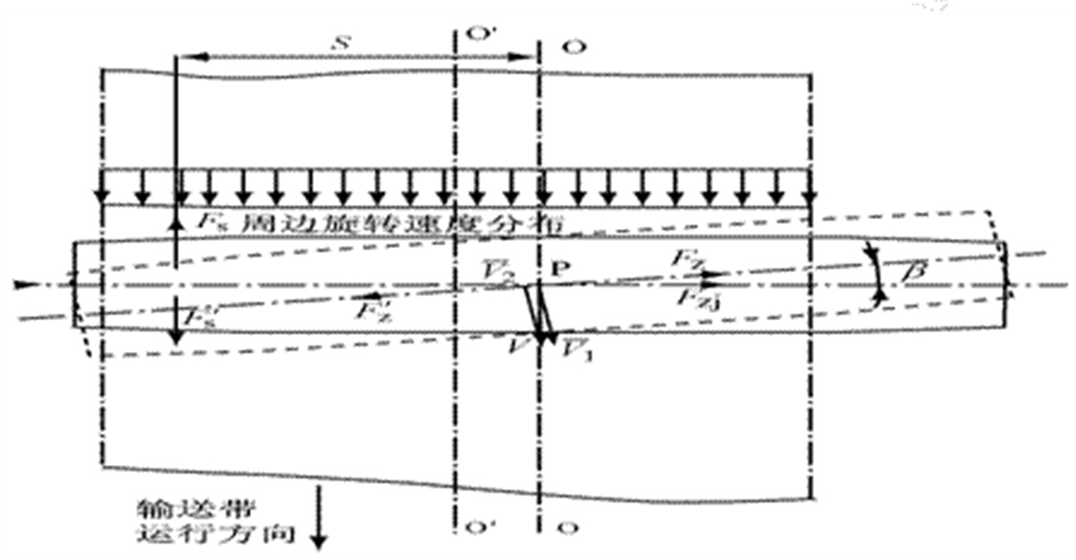 在旋轉力矩M 的作用下,滾筒繞中央樞軸向輸送帶前進方向旋轉了β角, 托輥旋轉的程度取決于輸送帶偏離中心的程度 。假設輸送帶上P 點 的速度為輸送帶運行速度V , 托輥上與P點相重合點的速度為V1 , 則: V = V1 + V2